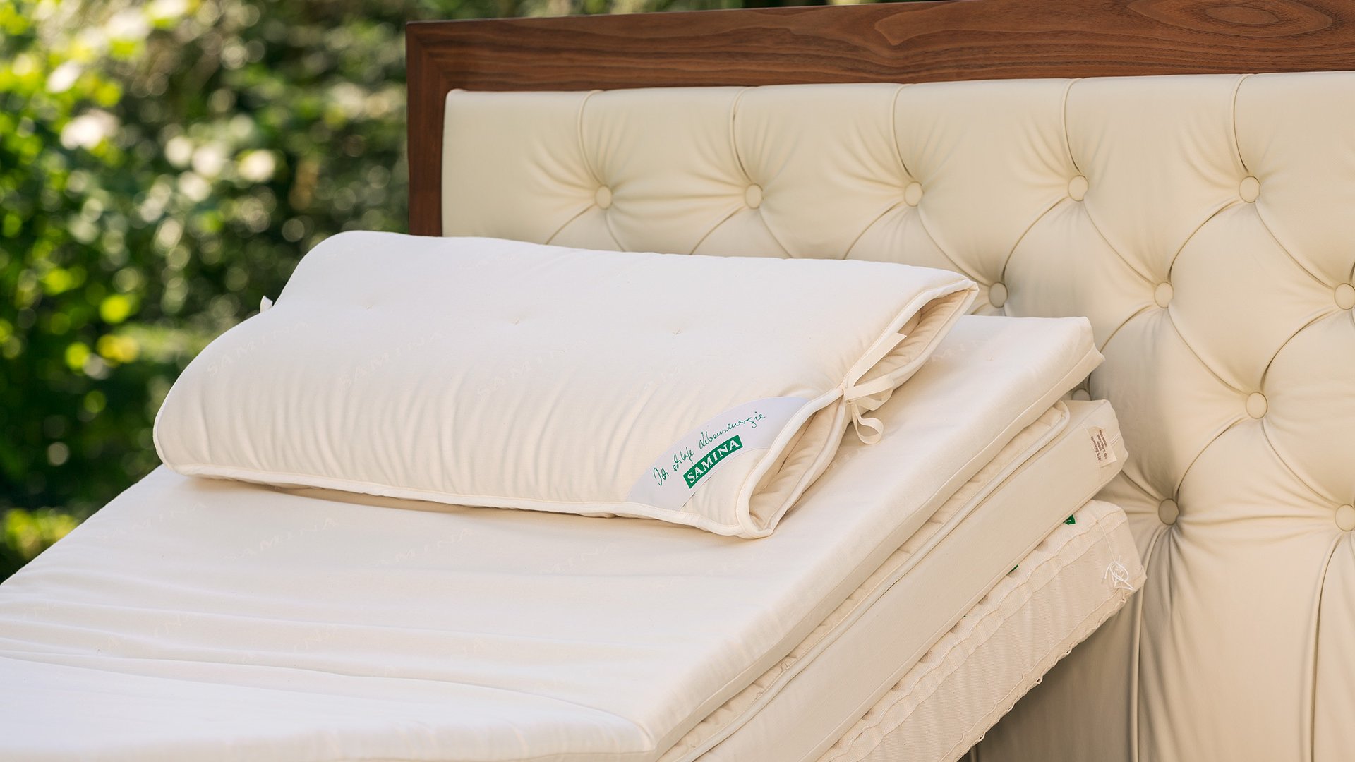 SAMINA verwendet nur Bio-Schafschurwolle, die bis zu 30 % ihres Eigengewichts an Feuchtigkeit aufnehmen kann, ohne sich feucht anzufühlen. Das verhindert nächtliches Schwitzen oder Frieren.